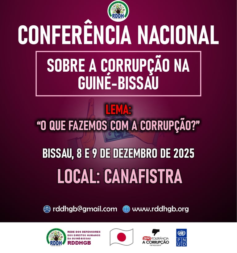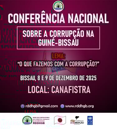 Nos dias 8 e 9 de dezembro de 2025, no espaço CanaFistra, Região de Biombo, arredores de Bissau, a Rede dos Defensores dos Direitos Humanos da Guiné-Bissau (RDDHGB) realiza a Conferência Nacional sobre a Corrupção na Guiné-Bissau, sob o lema “O que fazemos com a corrupção?”.
